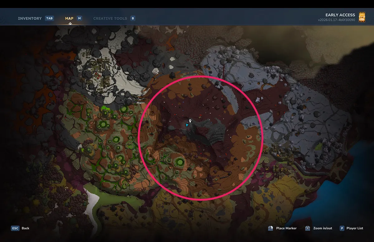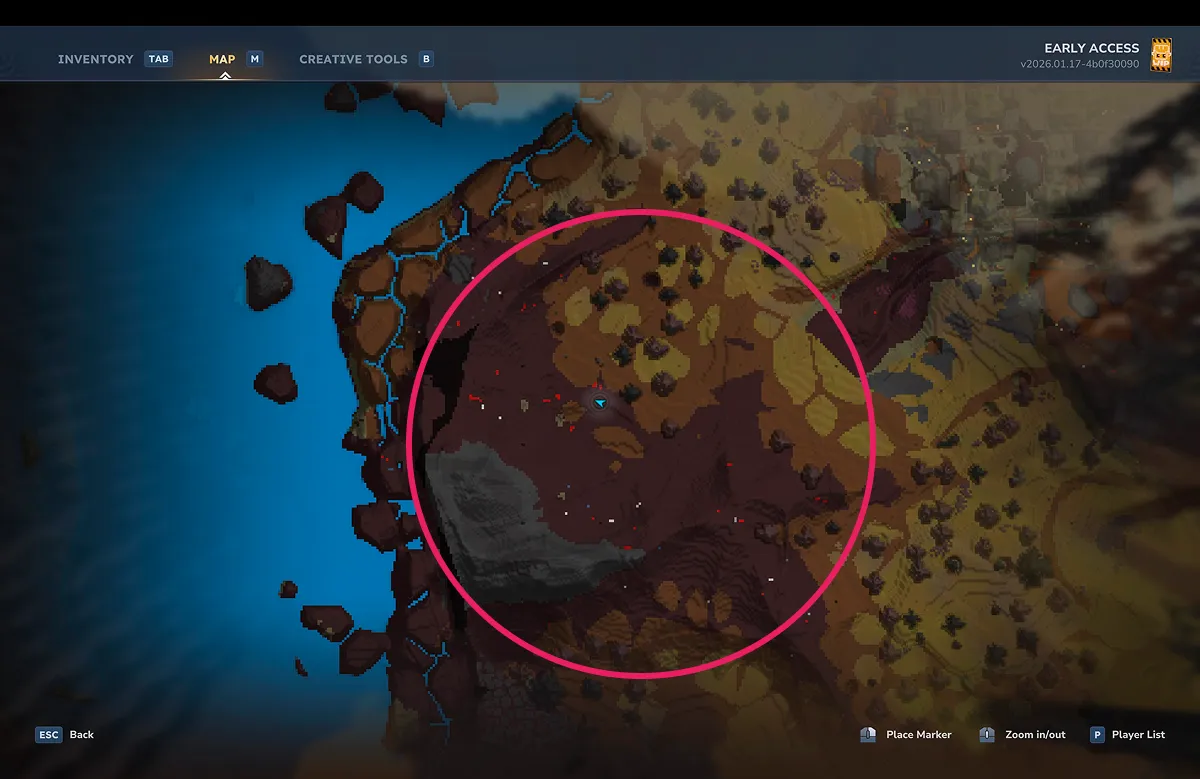 - 初期スポーン西側にある火山ゾーンから、さらに北上した箇所
