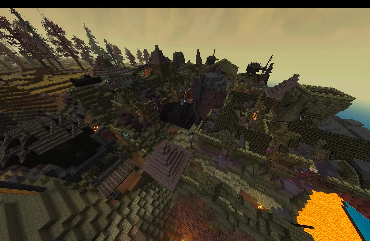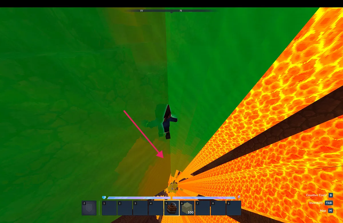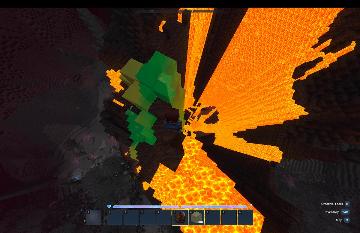 当記事では、明るさ確保のためにクリエイティブモードを使用していますが、火山ゾーン夜は、かなりの暗闇になり隙間からの落下死のおそれがあります。
