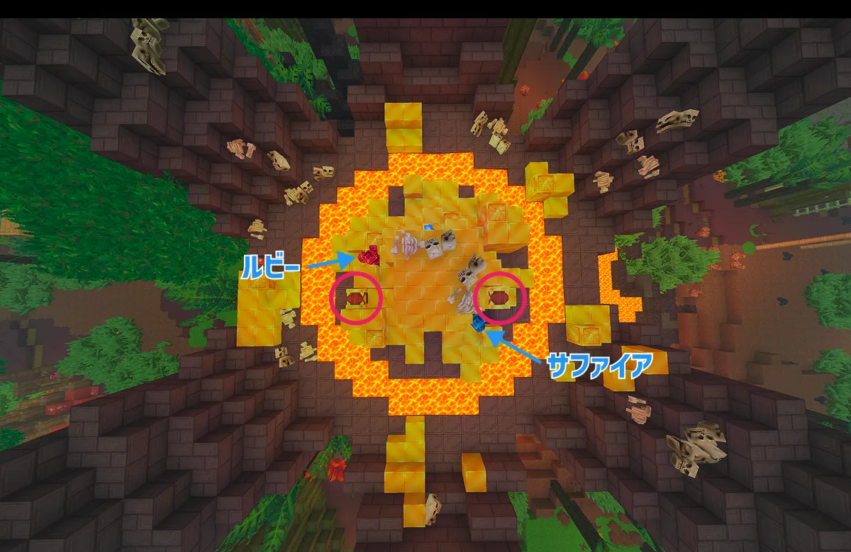宝物湖にはチェスト2コとルビー・サファイアが1つずつ生成されます。