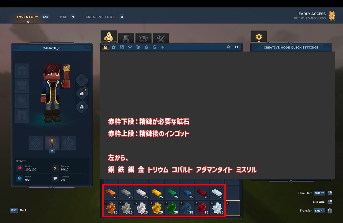 ※ミスリルのみ、【早期アクセス版バージョン2026.01.17】時点では、まだ採掘場所が不明です。