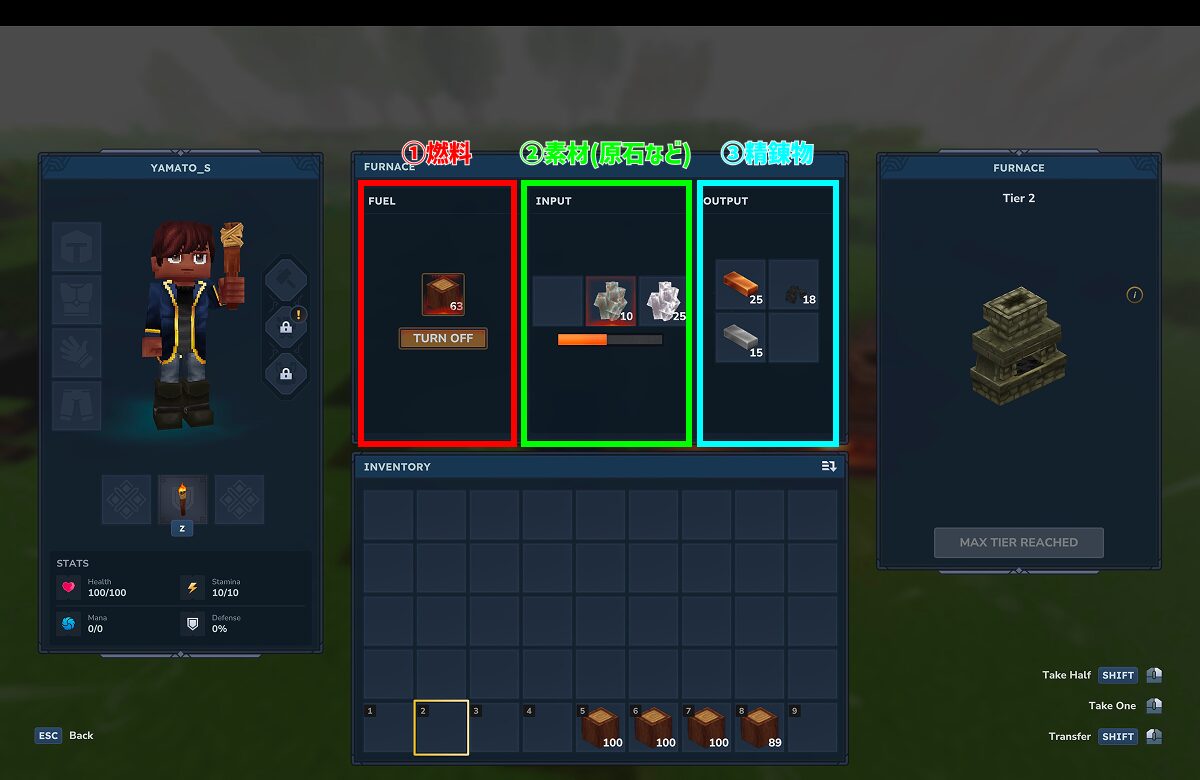 ※木の棒も燃料にできますが、①②に比べると燃焼効率が悪いため、①②推奨です。