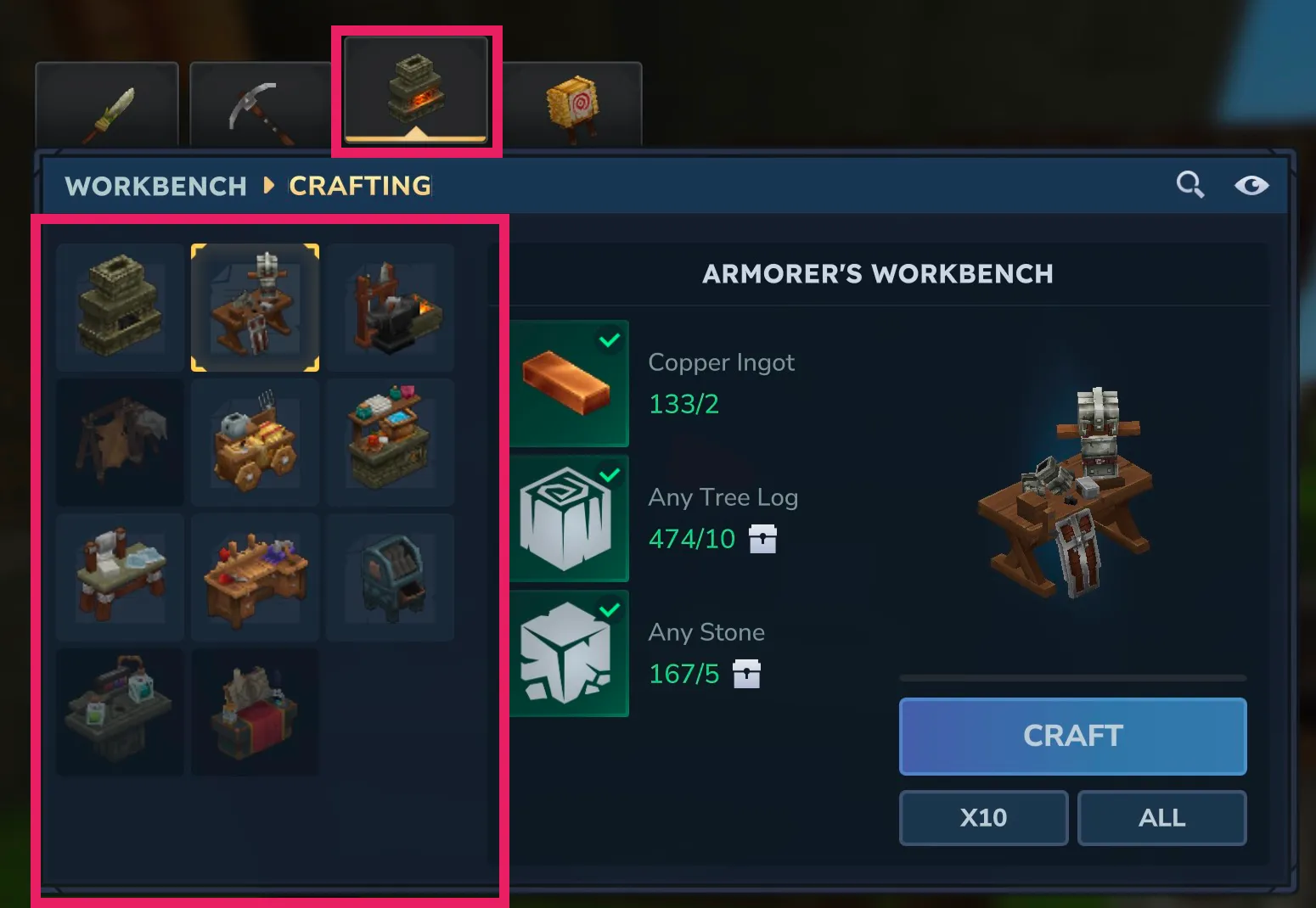 Hytaleではワークベンチが豊富で、通常のワークベンチを入れると9コのワークベンチを作成できます。